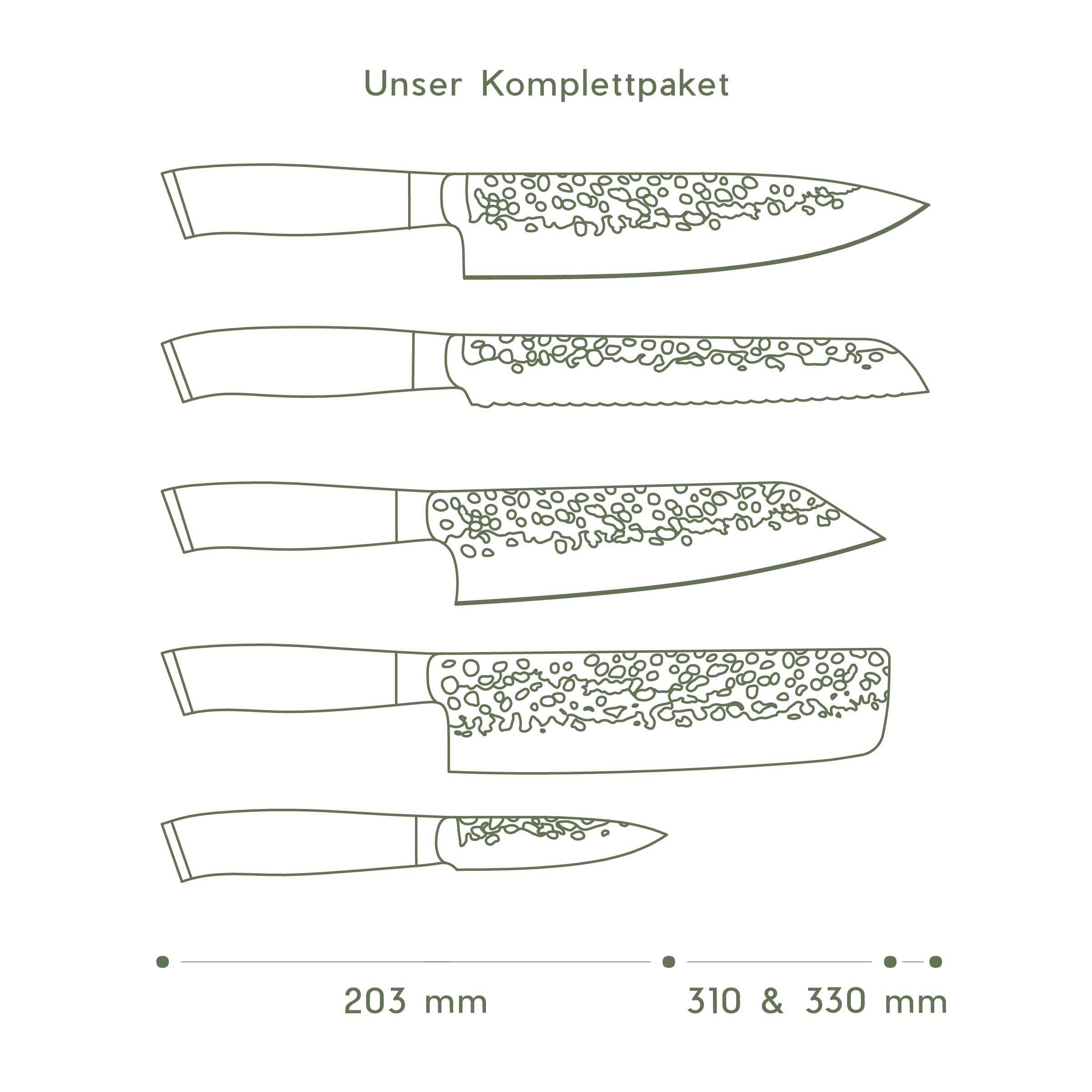 Das „Gourmet Messer Set“ von FIVI – Die komplette Lösung für jede Schneidaufgabe! Jedes Messer in diesem Set – YUKI, MATT, ROLF, BERND und LUCA – besteht aus robustem, scharfem deutschen Stahl und besitzt einen ergonomischen, pflegeleichten Pakkaholz-Griff. Dank des charakteristischen Hammerschlags gleiten die Klingen mühelos durch jede Zutat und sorgen für ein unvergleichlich angenehmes Schneideerlebnis. Ob feine Schnitte, kraftvolles Hacken oder müheloses Brotschneiden – dieses Set hat das perfekte Messer für jede Herausforderung.